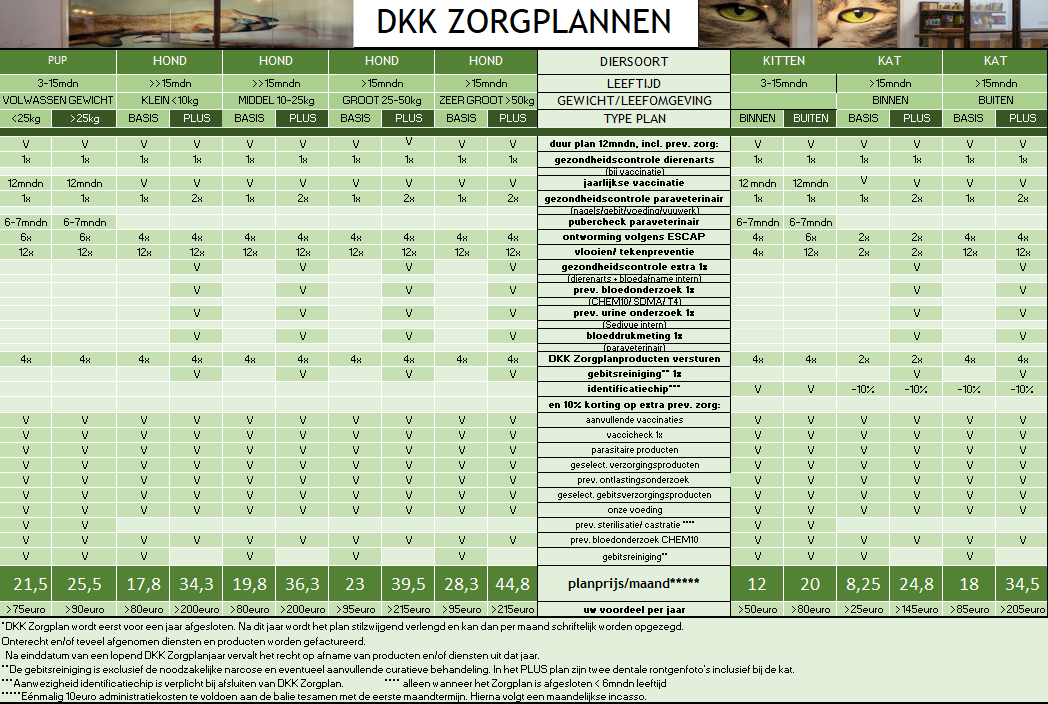 Het DKK Zorgplan creëert voor u als eigenaar en voor ons als dierenarts een win-win situatie: u bent verzekerd van de best passende preventieve zorg voor uw dier en wij hebben het dier ‘in beeld’, zodat problemen eerder opgespoord en behandeld kunnen worden, maar liever nog, tijdig voorkomen kunnen worden. Het DKK Zorgplan is geen (ziektekosten-)verzekering maar een overeenkomst die u met ons aangaat om een jaar preventieve zorgproducten van ons af te nemen voor een vast bedrag per maand en kan dus prima afgesloten worden naast een al bestaande ziektekostenverzekering.